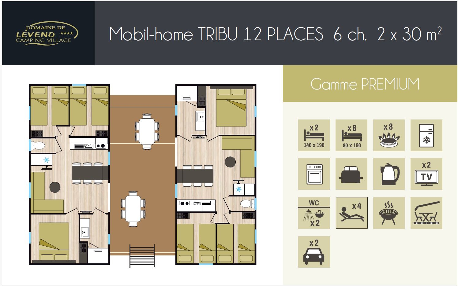 LES PLUS : Convivialité garantie avec ces deux mobil-homes récents et confortables se rejoignant par une terrasse couverte commune. Un espace de vie apprécié par les familles nombreuses ou les groupes d’amis. Trouvez tous les équipements de la gamme CONFORT.